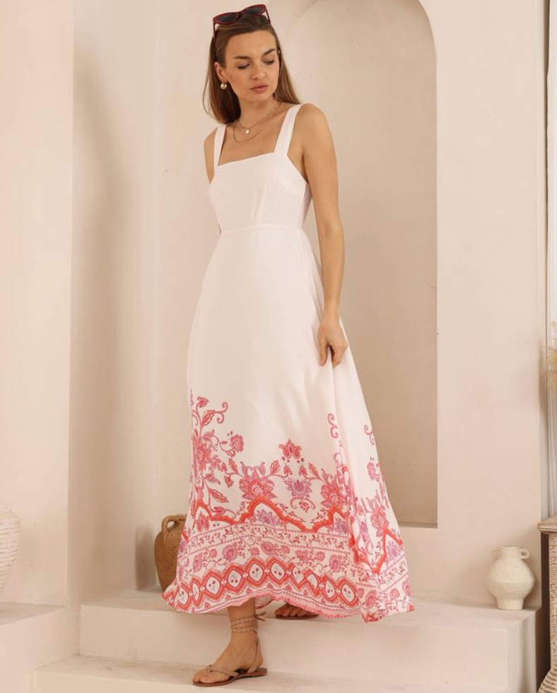 The Strawberry Maxi Dress by Iris Maxi is a standout piece designed for effortless summer styling. Featuring wide, adjustable shoulder straps and a flattering square neckline, this maxi dress offers both comfort and support. The shirred back panel ensures a flexible fit, while the flowing maxi-length skirt creates an elegant silhouette.