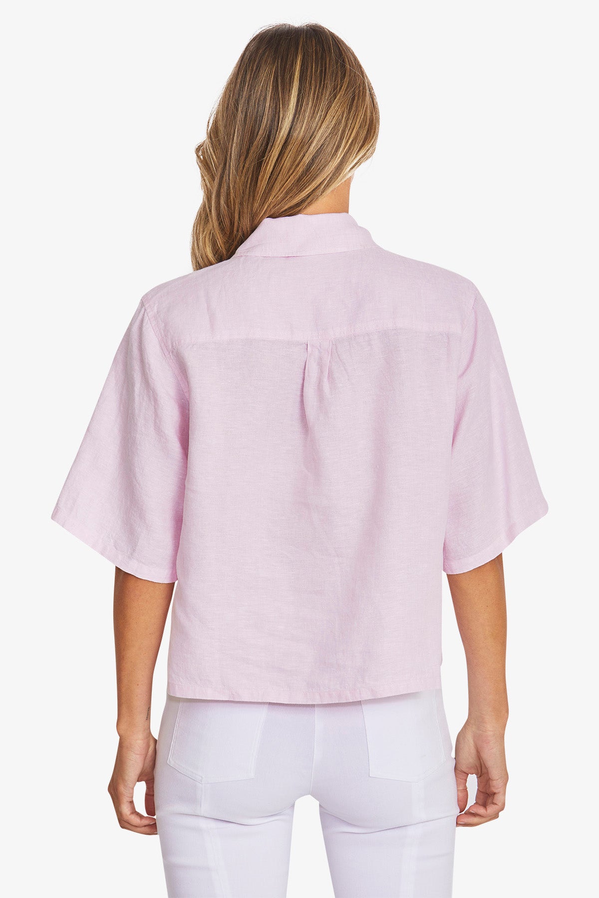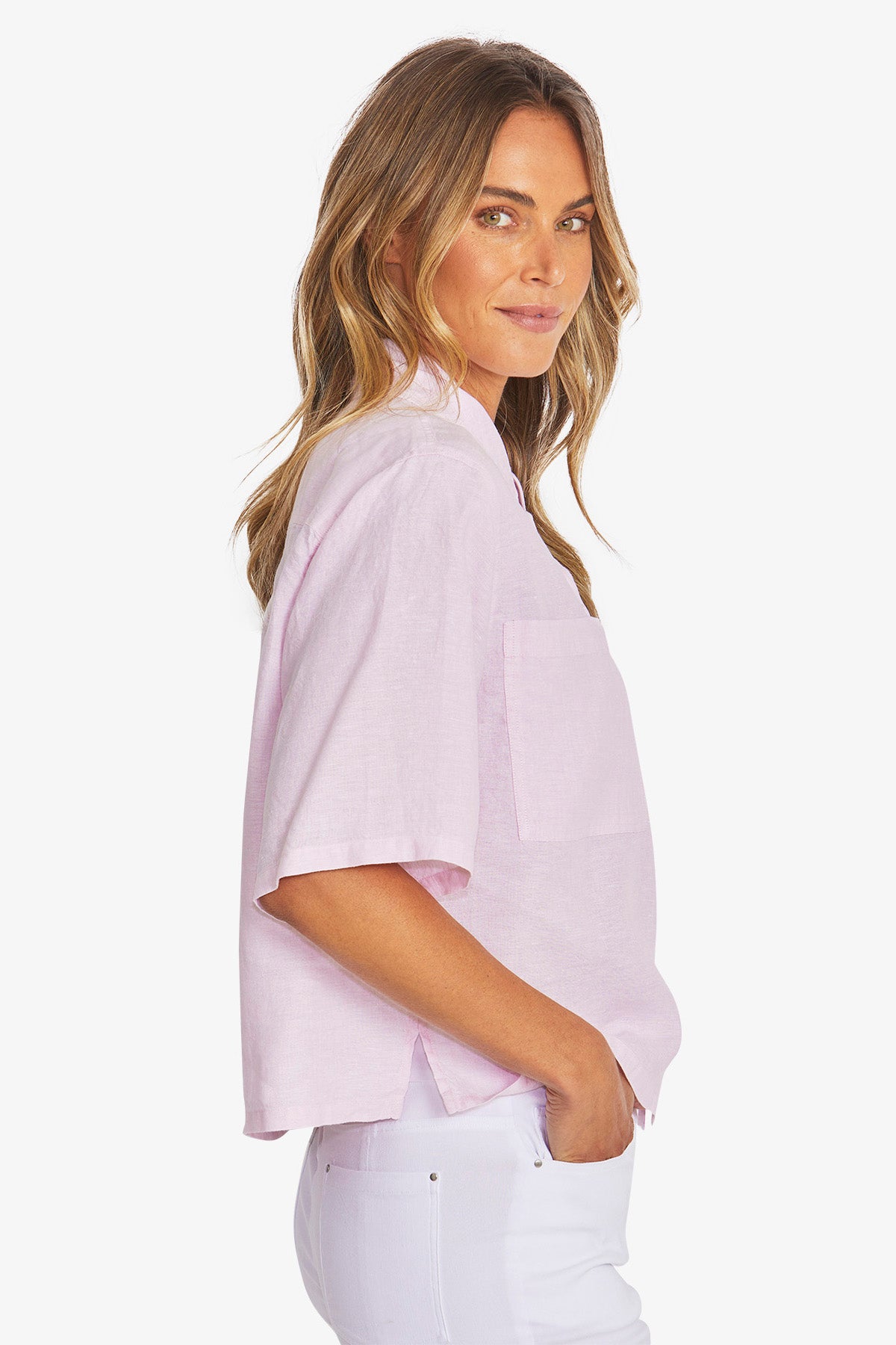 Featured in a gorgeous pearl pink and relaxed cropped fit, this button-up offers a fresh take on a timeless classic.