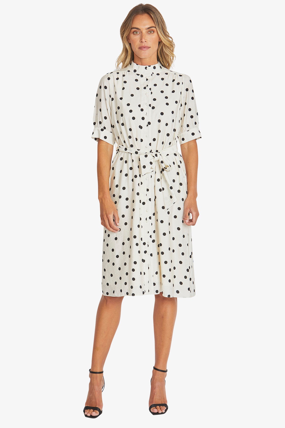 Upgrade your wardrobe with this gorgeous polka dot Pamela dress with tie belt for a chic effect.