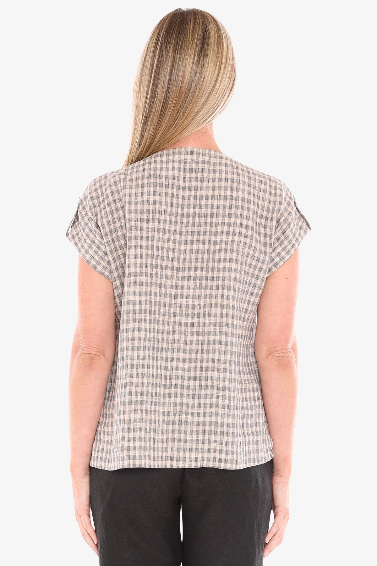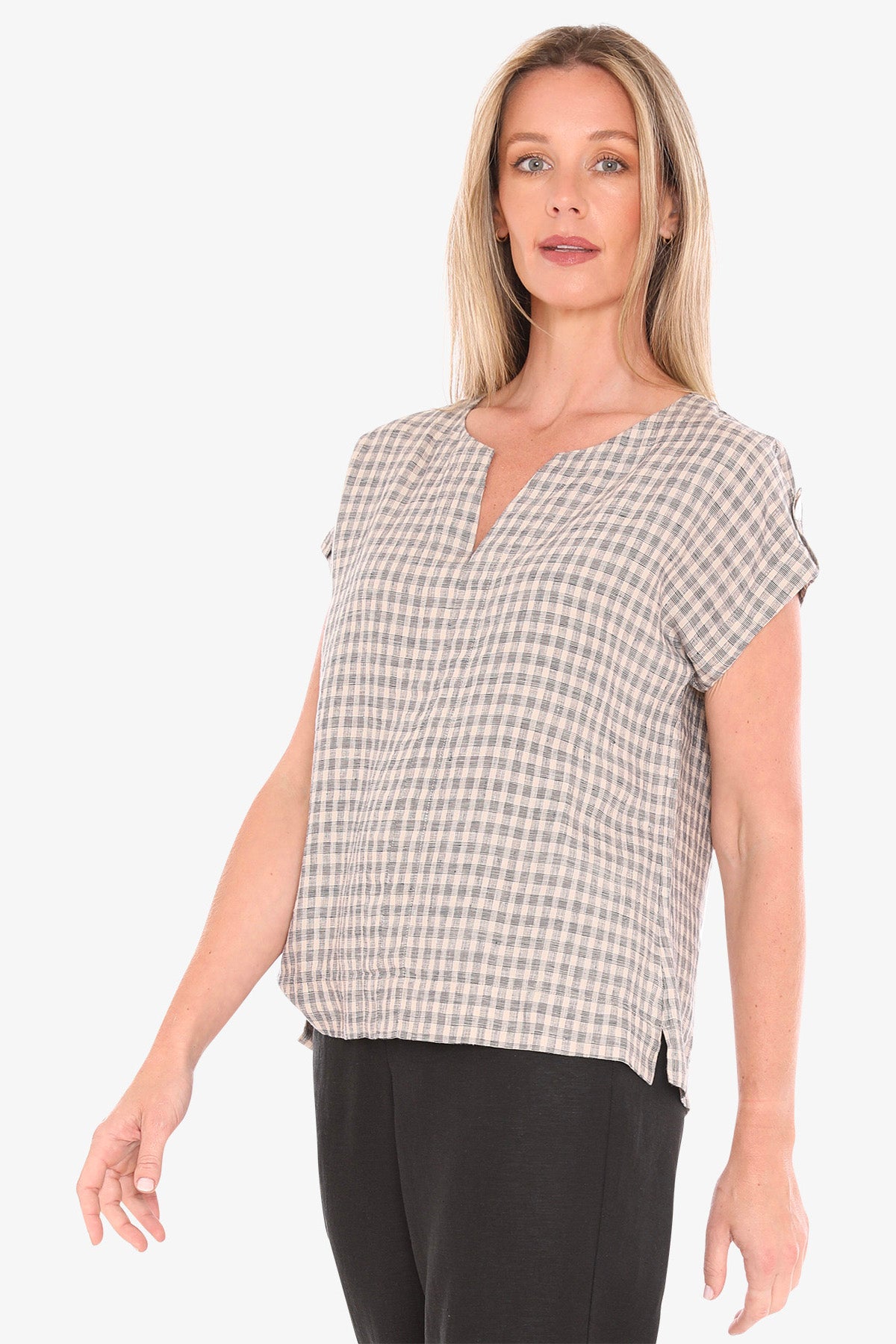 Cut from the softest cotton, this Grid Check Top by Jump Clothing boasts a modern, notched v-neckline and short cap sleeves. Perfect for year-round layering, the effortless tee is complete with black pants or a pair of jeans.Colour: Sand/Ink