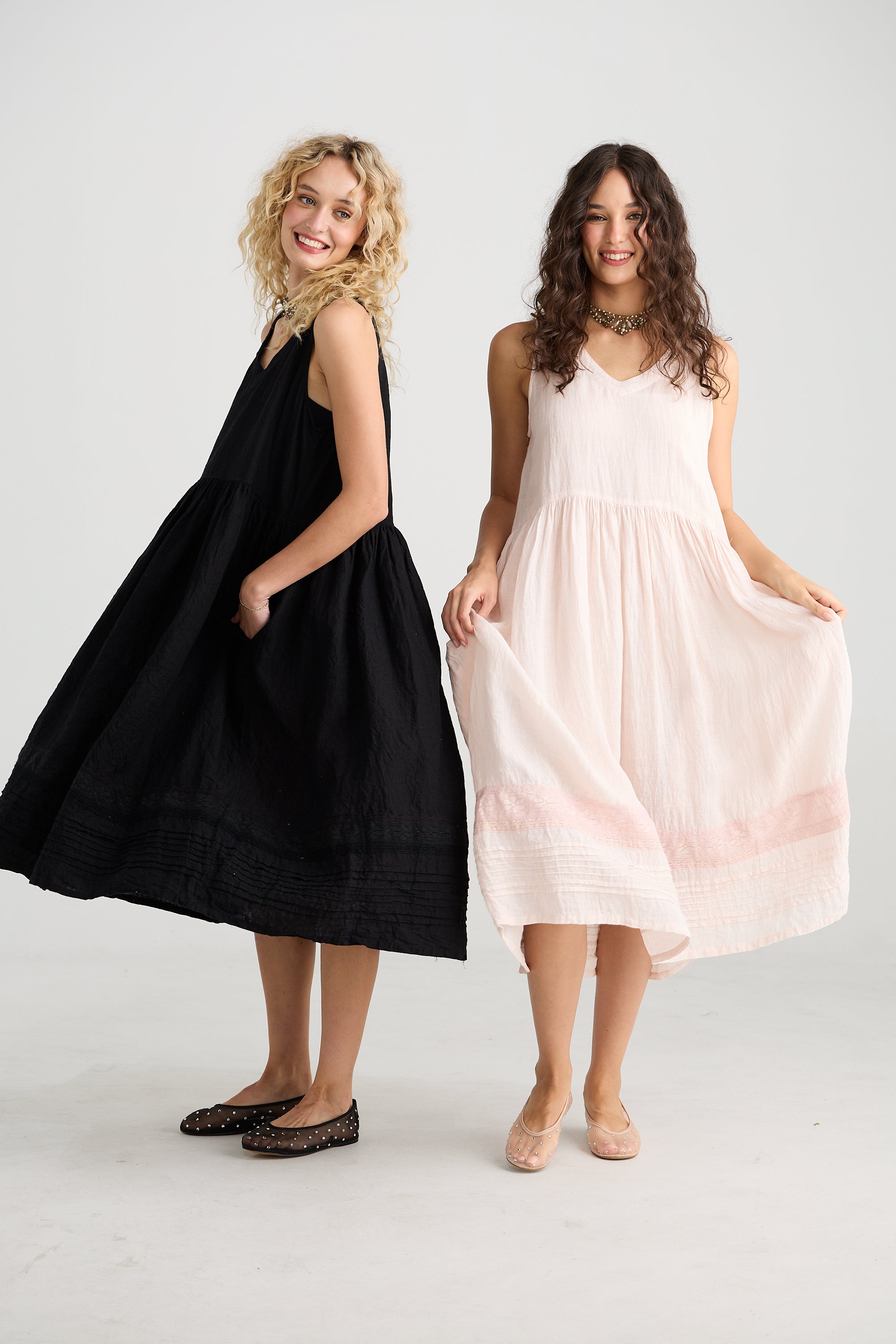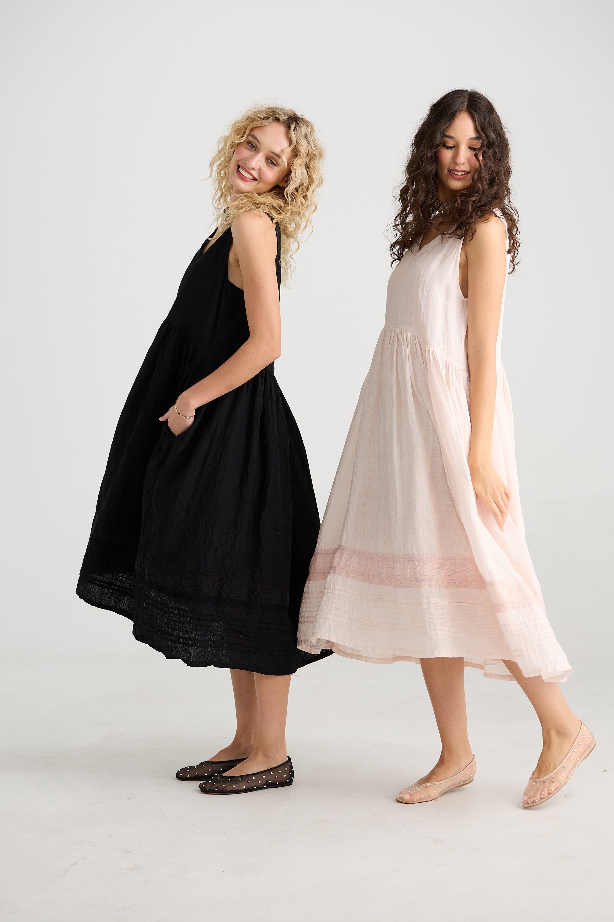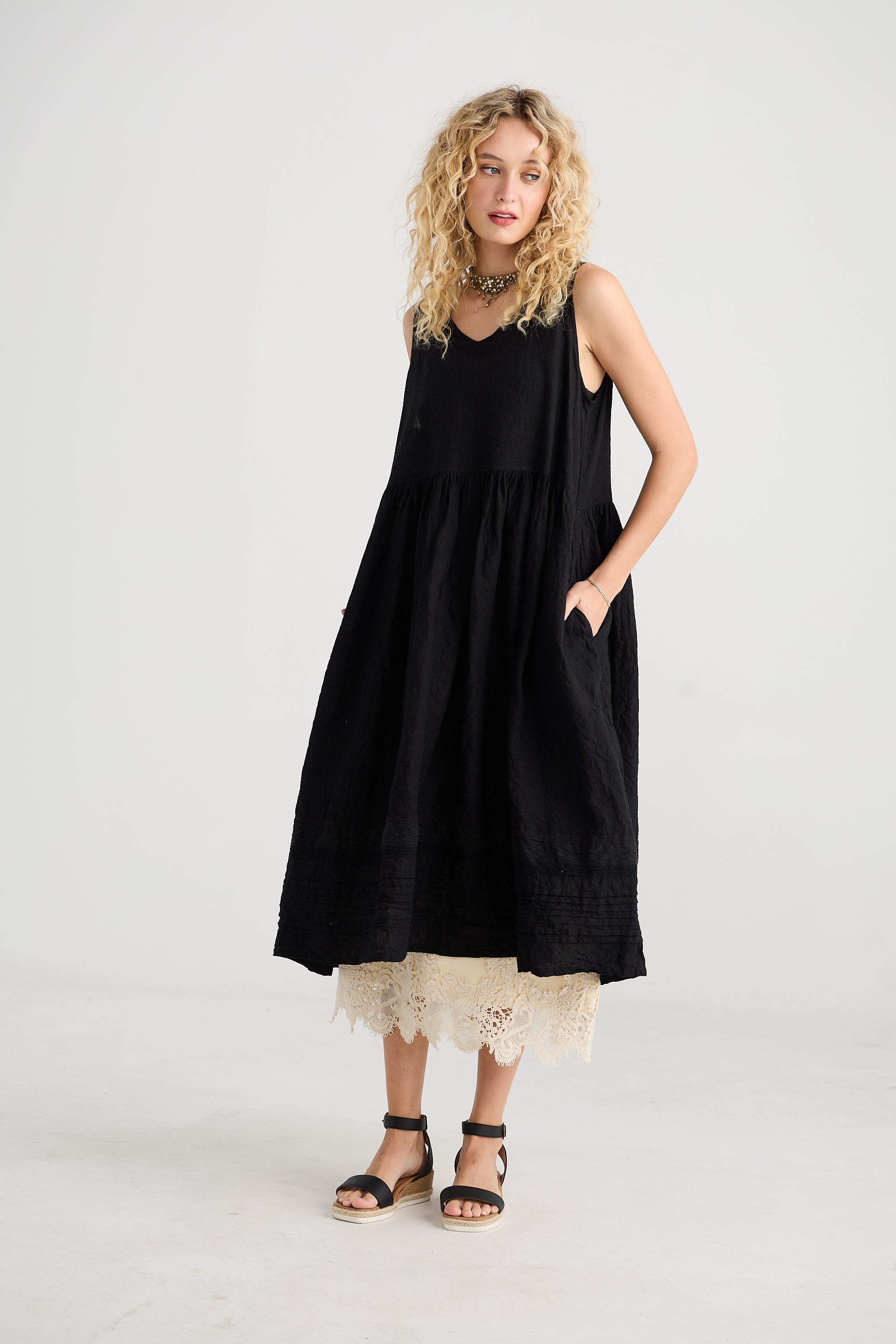 It has the added charm of beautiful detailing with fine pintucks and vintage lace adorning the skirt of the dress. Soft v-neck and pockets too - the perfect dress for an afternoon in the city or an evening out.